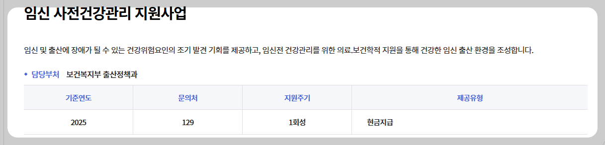 임신 사전건강관리 지원사업 이란 임신 및 출산에 장애가 될수 있는 건강위험요인의 조기 발견 기회를 제공하고, 임신전 건강관리를 위한 의료, 보건학적 지원을 통해 건강한 임신 출산 환경을 조성하기 위하여 중앙부처에서 진행하는 사업입니다.